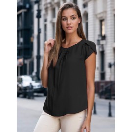 Women's Round Neck Pleated Blouse Cap Sleeve Curved Keyhole Back Chiffon Top