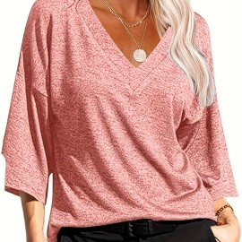 Women's Three Quarter Sleeve T-Shirt Summer V Neck Top Vintage Cotton Basic T-Shirt