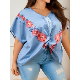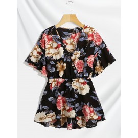 Plus Size Floral Charm - Chic Crew Neck Blouse with Ruffle Sleeves - Trendy Casual Wear for Spring & Summer - Curvy Womens Fashion